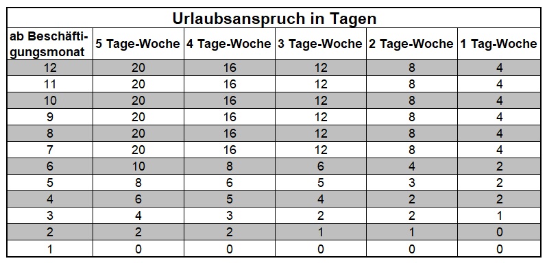 Die eingezeichneten (Gesamt-)Urlaubsansprüche des Jahres bestehen jeweils ab dem Ersten des Monats. Ab dem 01.01.2026 besteht der neue (bei 5-Tage-Woche) 20-tägige Urlaubsanspruch für 2026.